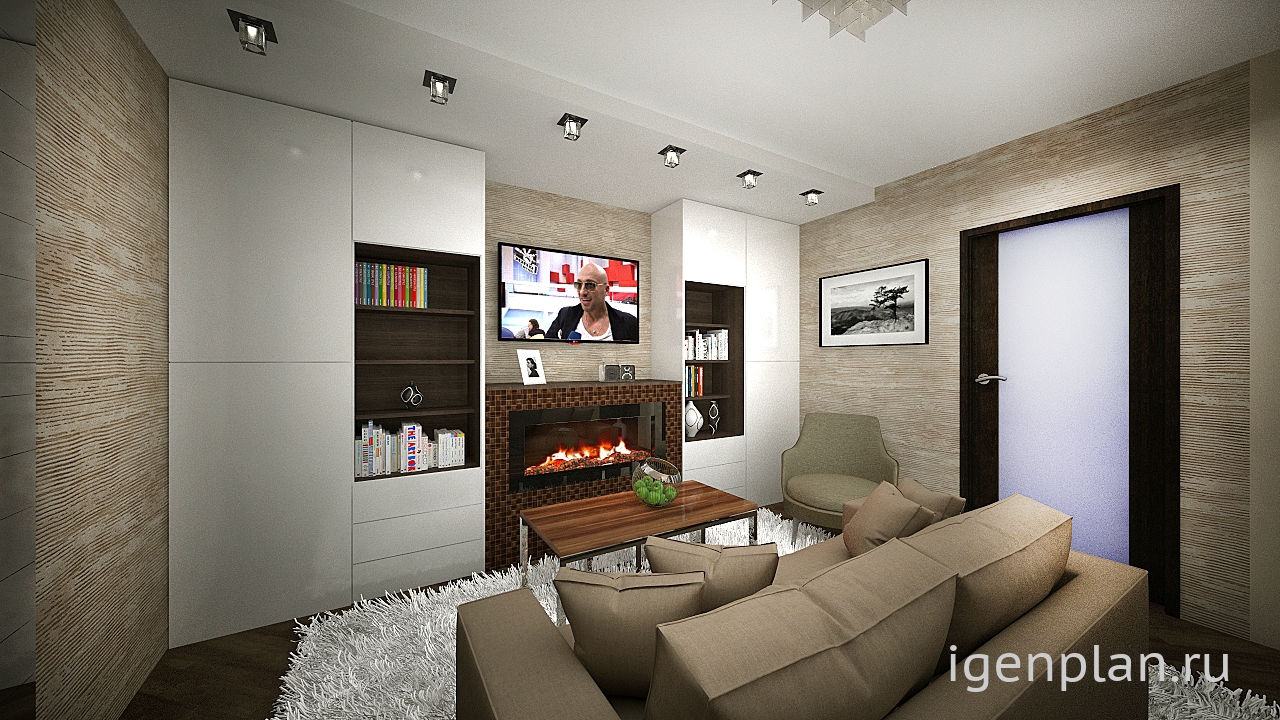 Задача поставленная перед нами стояла так: Отдельная кухня, отдельная спальня для взрослых, детская и гостиная с камином. Для расширения площади квартиры, мы объединили балконы с комнатами — детской и спальни. Это дало нам возможность создать небольшую гостиную в центре квартиры. Так же в целях экономии пространства мы используем раздвижные двери. Стилистическое решение лаконичное. Особое внимание уделяется фактурам. — это мозаика в отделке камина деревянные колонны и каменная кладка в кухне.