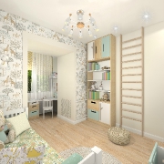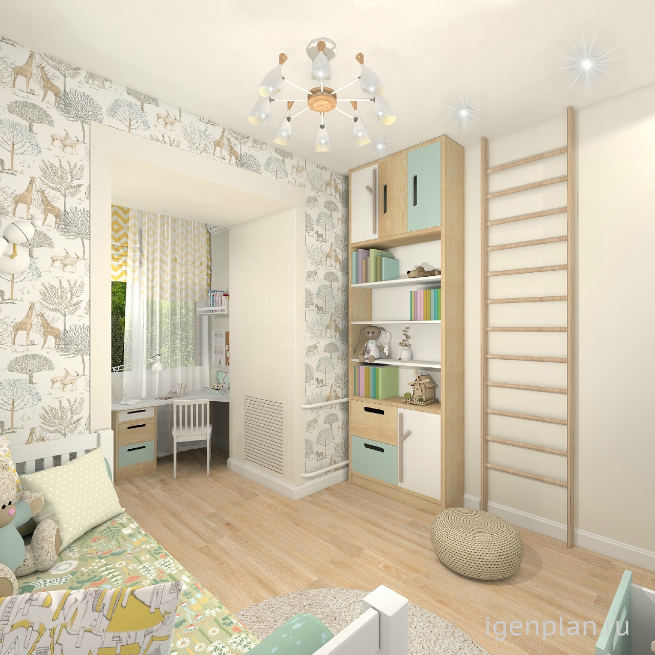 Детская комната также объединена с лоджией, где расположилась рабочая зона и зона отдыха. В основной части комнаты выделен вместительный шкаф для детской одежды, спальное место, место хранения, игровая шведская стенка. Использовались яркие акценты и отделка стен (покраска, обои), на полу - пробка с фотопечатью Корки Стайл.