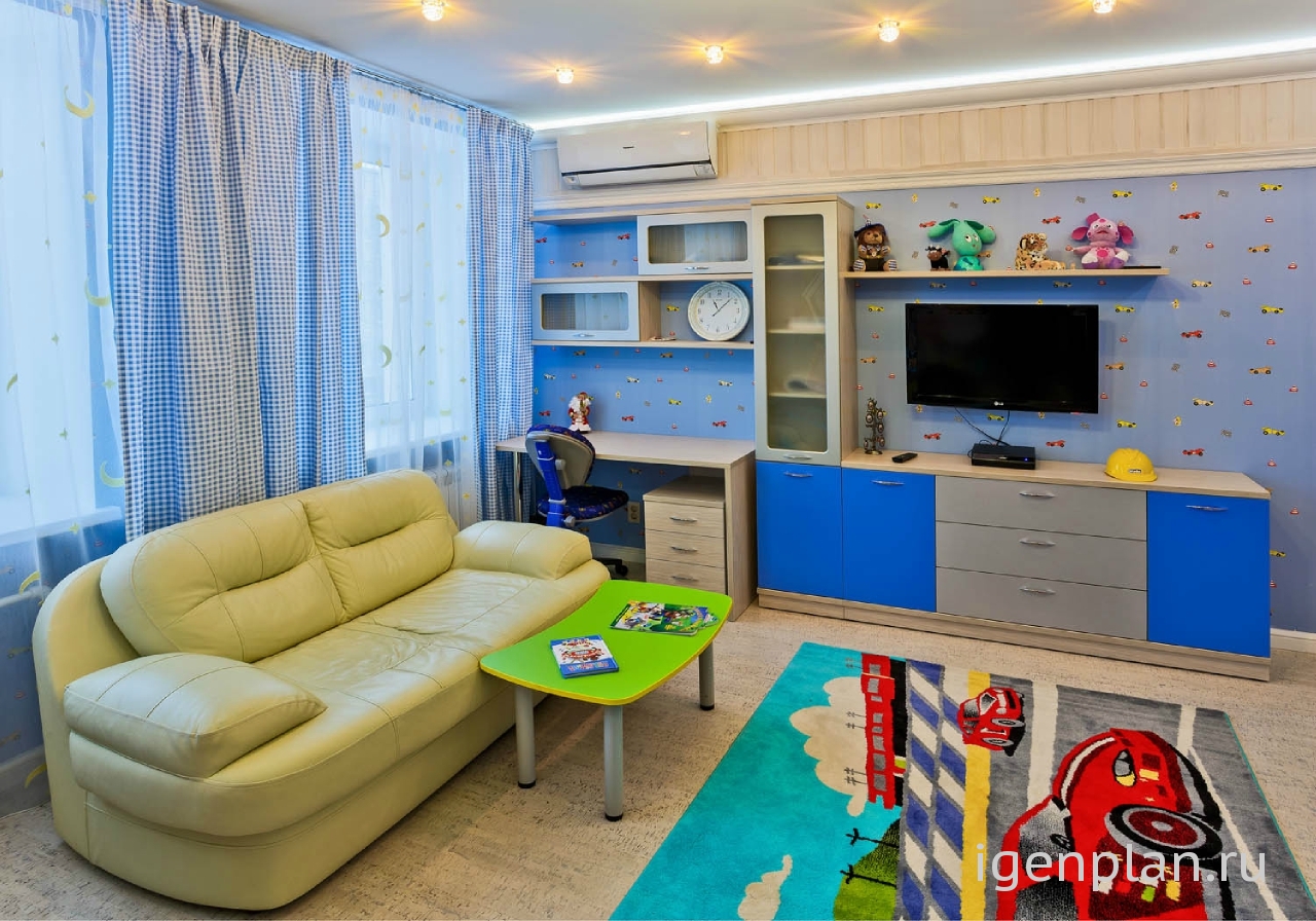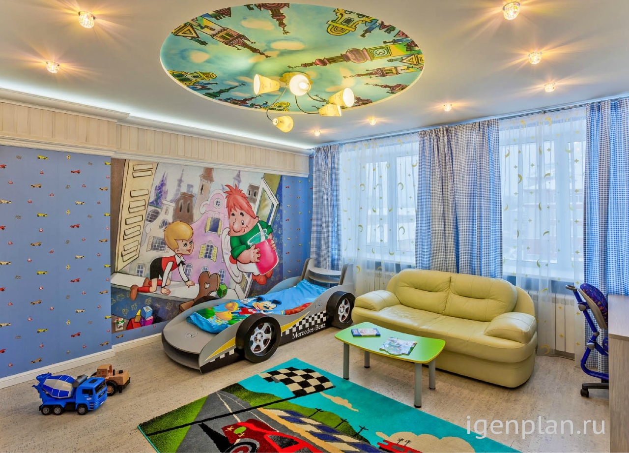 Отличный дизайн, с удовольствием бы сделала для своего сына детскую с таким же интерьером! Маленький владелец этой комнаты наверняка от нее в полном восторге – ярко, просторно, весело. Для маленького мальчика то, что нужно. И все продумано – есть куда убрать одежду, игрушки, и где уроки делать ,когда подрастет, и куда маме с книжкой сесть. И засыпать малыш всегда будет в хорошем настроении. Как оно может быть плохим ,когда лежишь в гоночной машинке и смотришь на сказочные домики? А из-за светлого деревянного пола и панелей у потолка создается общее впечатление тепла и уюта. Мамы оценят, детям понравится!