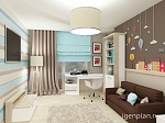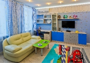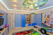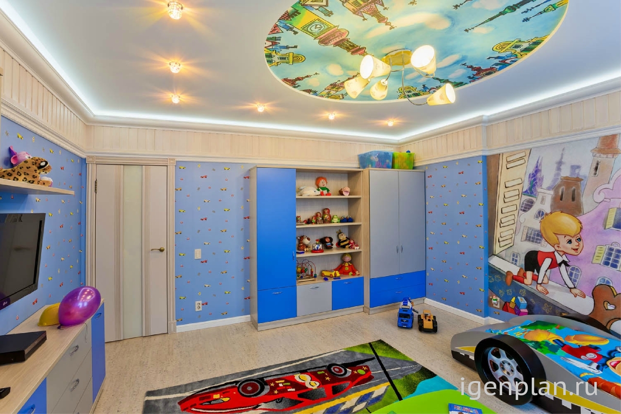 При проектировании квартира стояла одна очень важная задача - создание дизайна детской комнаты маленького мальчика двух лет. В комнате хотелось создать атмосферу уюта и детской задорности. И в голову пришли такие персонажи, как Малыш и Карлсон, которые отличаются своей игривостью и веселым настроением. Изображения главных героев появились в изголовье кровати в виде фрески. так как один из главных героев живет на крыше, захотелось отобразить и это. По этой причине на потолке появились изображения крыш из знаменитого города Стокгольма.