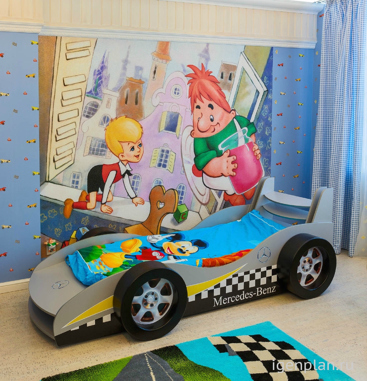 Так как эта комната принадлежит мальчику, кровать была выбрана в виде машинки - мечты каждого малыша. В поддержку ей обои тоже с изображением машинок.