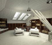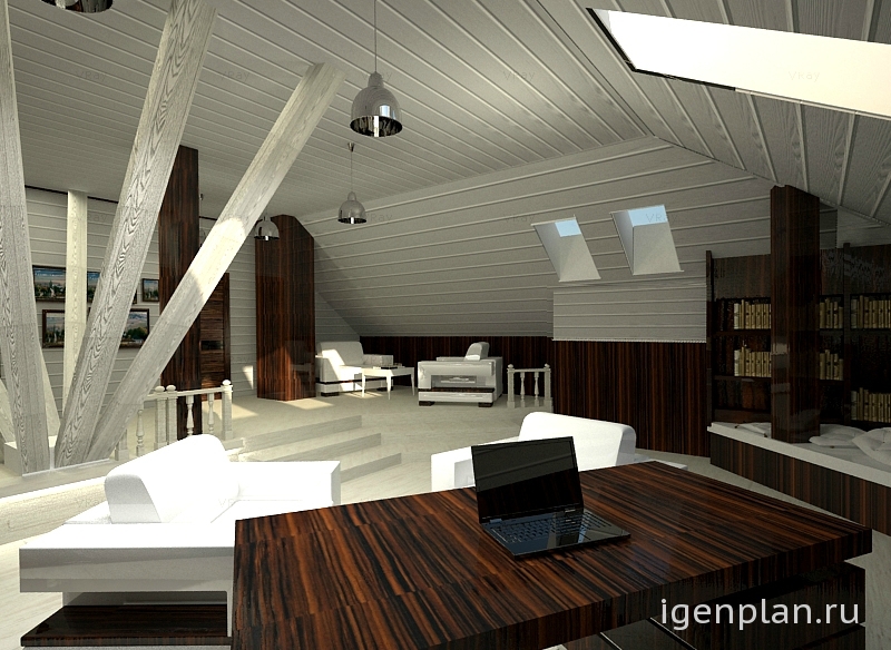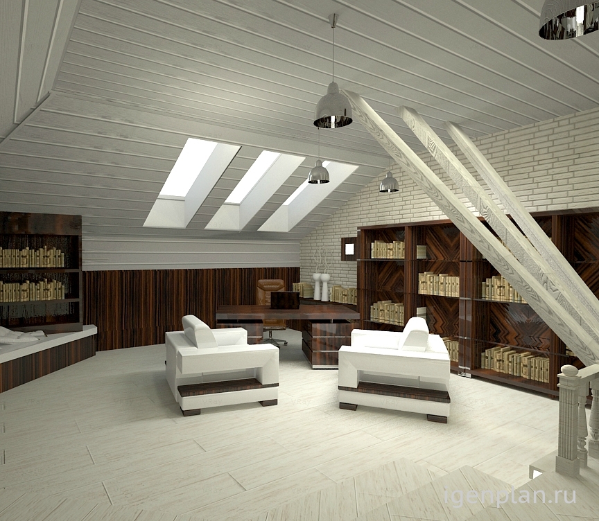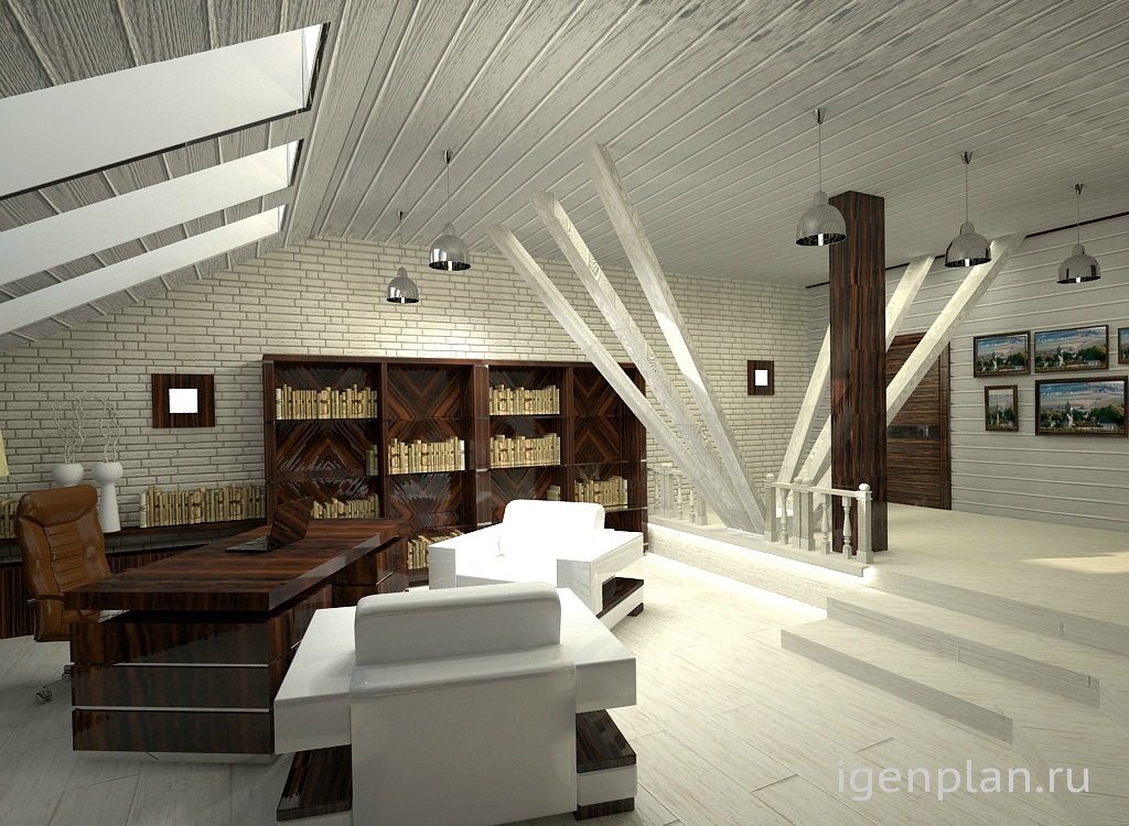 Очень понравился кабинет мансардном кабинете, эти стилизованные балки в совокупности