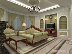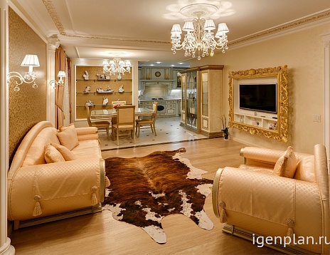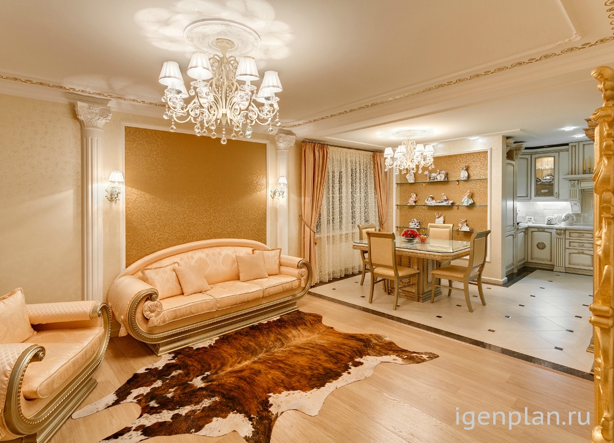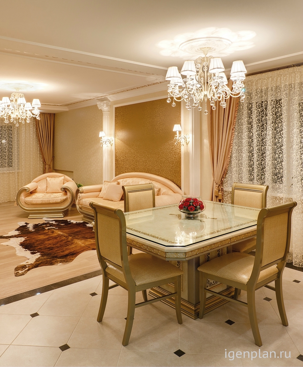 Тут одна только фарфоровая статуэтка чего стоит. Да и диваны. Шик - это то слово, что подходит для дизайна гостиной. Антон Лалетин порадовал.
