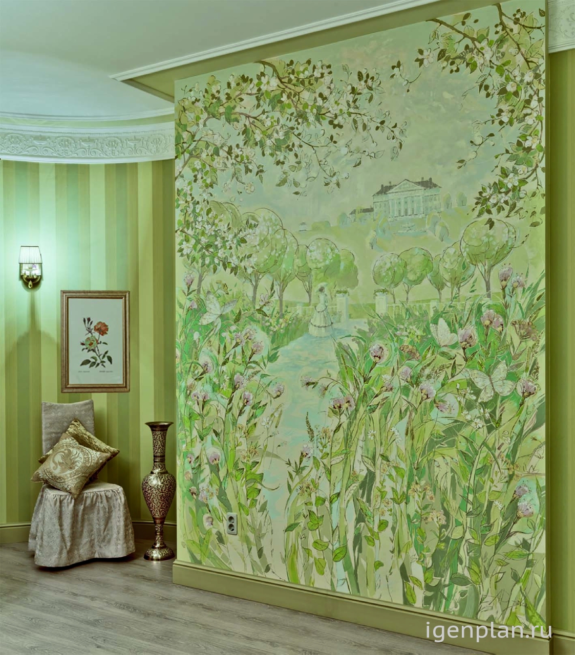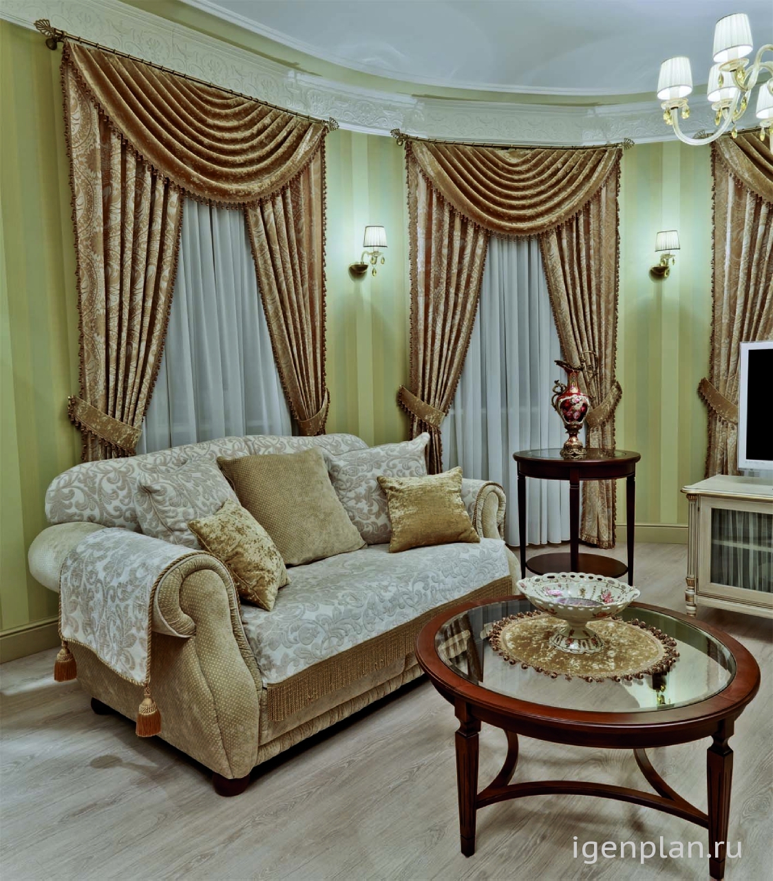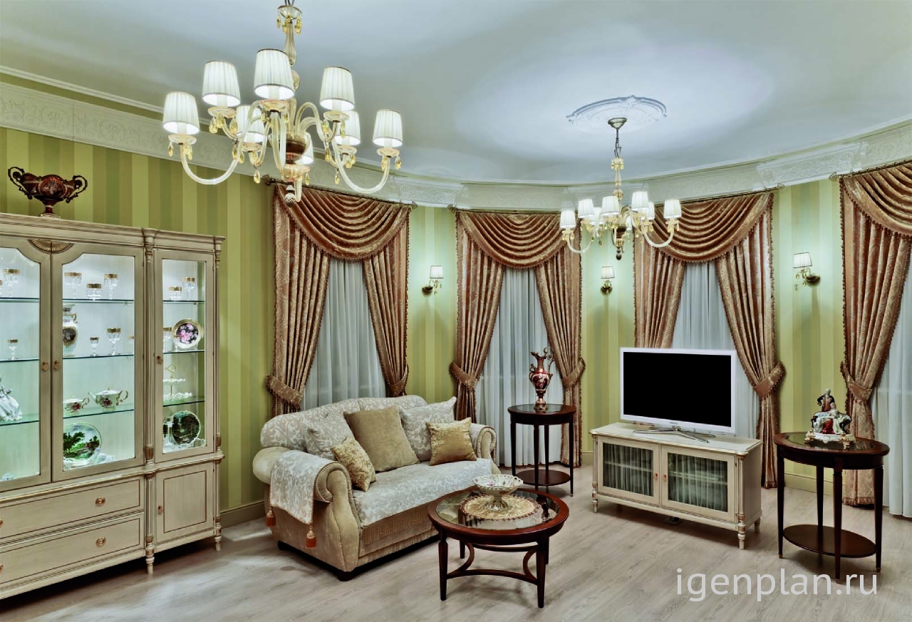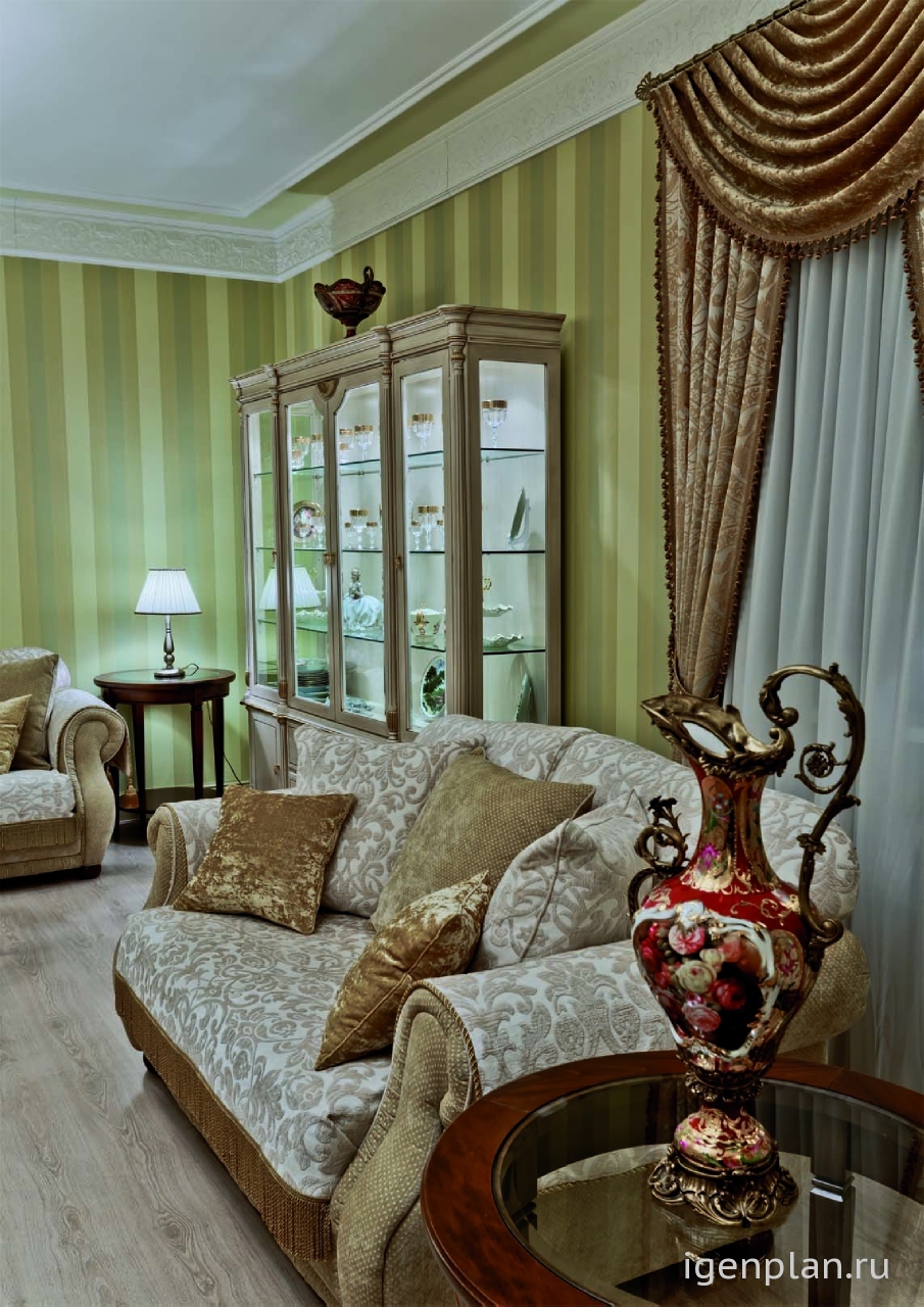 Изысканный интерьер в зеленовато-песочных тонах. Невозможно представить в нем спешащих людей - представляется размеренность, неспешность и чай из тонкого фарфора в полдень. Все элементы дизайна и изящные – довольно широкие - бордюры под потолком, изысканные вазы, золотистые портьеры, горки с посудой – все атрибуты создают пространство для философствования и неторопливых спокойных бесед. Медальон на входной распашной двери перекликается с медальонами на потолке, а светлая – песочного цвета мебель как нельзя лучше дополняет этот рай для сибаритов . Акцент гостиной - панно с изображением травяного УМИРОТВОРЕНИЯ, которое безусловно будет притягивать взгляд из любой точки помещения Интересно был ли у дизайнера заказчик на этот проект? и какой он, этот заказчик Мне кажется, что интерьер очень подойдет для северных городов, где мало солнца Глафира |