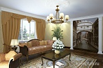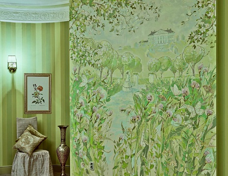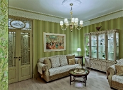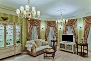 Среднеполосные мотивы, спокойные цвета. роспись "явлоневый сад", картины с замками, балами и лошадьми, благородная мебель и предметы интерьера, архитектурный декор, широкие плинтусы и карнизы, двери и люстры - в продуманном до мелочей интерьере нет случайных вещей и сочетаний. Все подобрано с большим вкусом, благодаря чему квартира дышит, выглядит гармоничной, располагающей к отдыху и философским беседам. (журнал "Современный дом и офис" декабрь 2013 КИРОВ стр. 62)