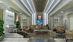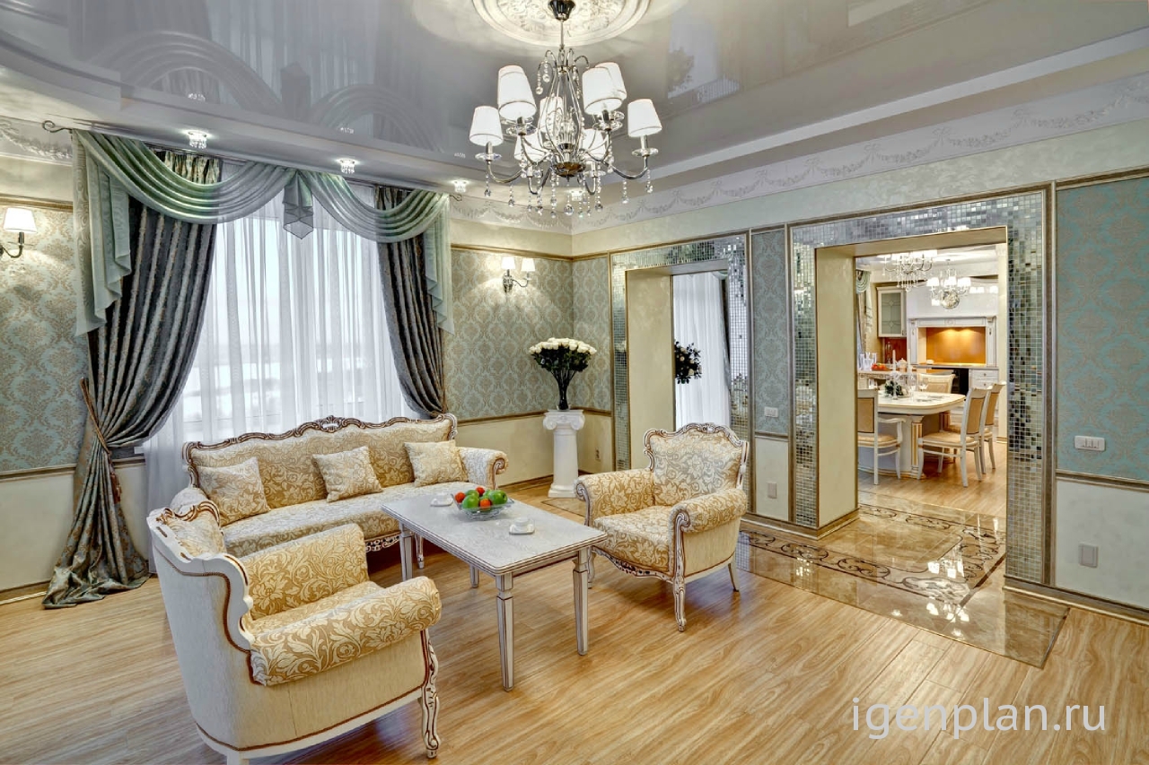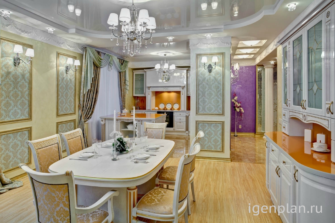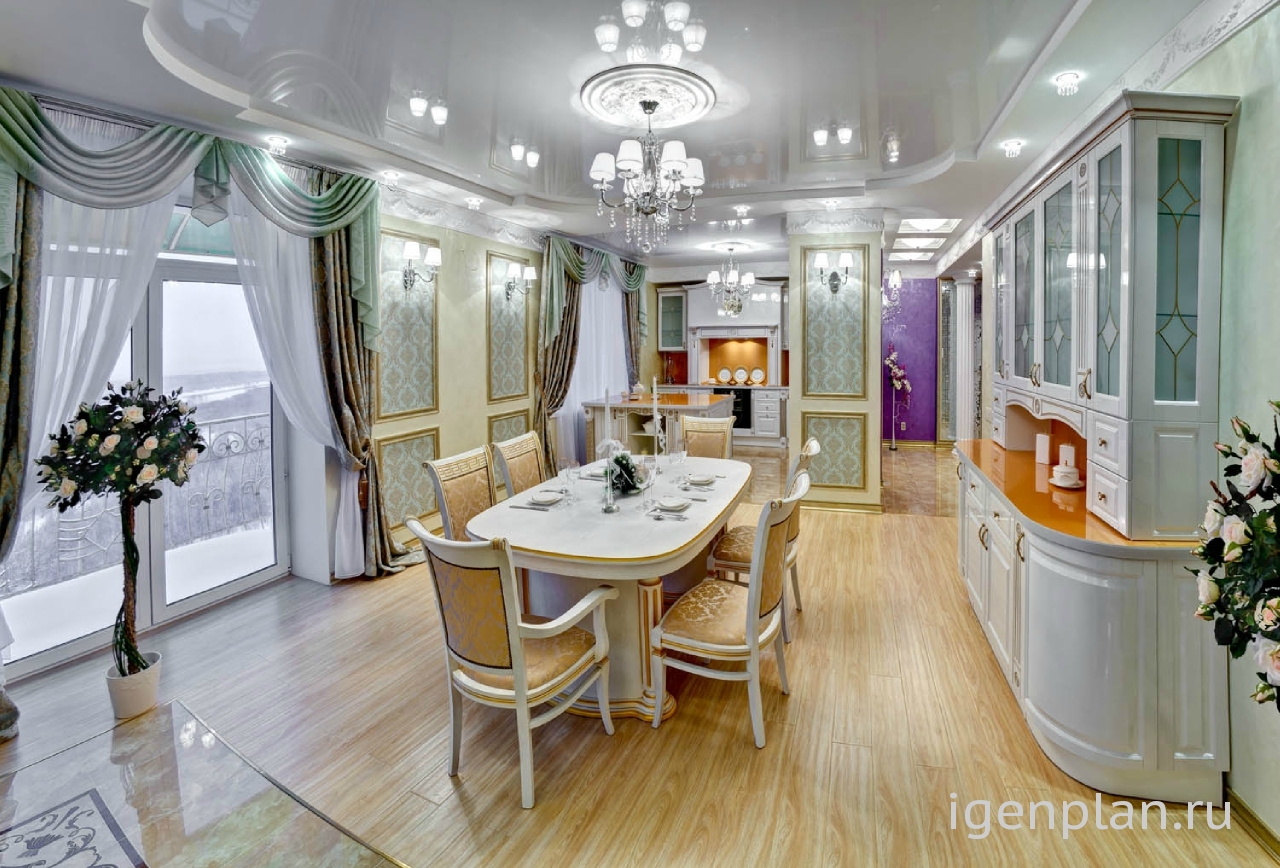 Но она ведь к гостиной не имеет отношения? Потом окно в снежный день в зоне столовой, которое начинается от пола - оно просто очаровало. Я бы стояла возле него и стояла Потом портьеры – удивительные такие… такие… богатые, элегантные, такие красивые по цвету И вдруг поняла, что мне очень нравится интерьер этой гостиной, и простор этого помещения и множество воздуха и пол, по которому можно разогнаться и скользить в тапочках (интересно там кто-нибудь разгоняется?) В белой глади натяжного потолка отражаются эолотисто-голубые панели на стенах и обтяжка стульев, белая блестящая мебель , свечи, приборы камииин - как же все здесь гармонично и торжественно, как белый снег, который идет за окном этой удивительной гостиной |
