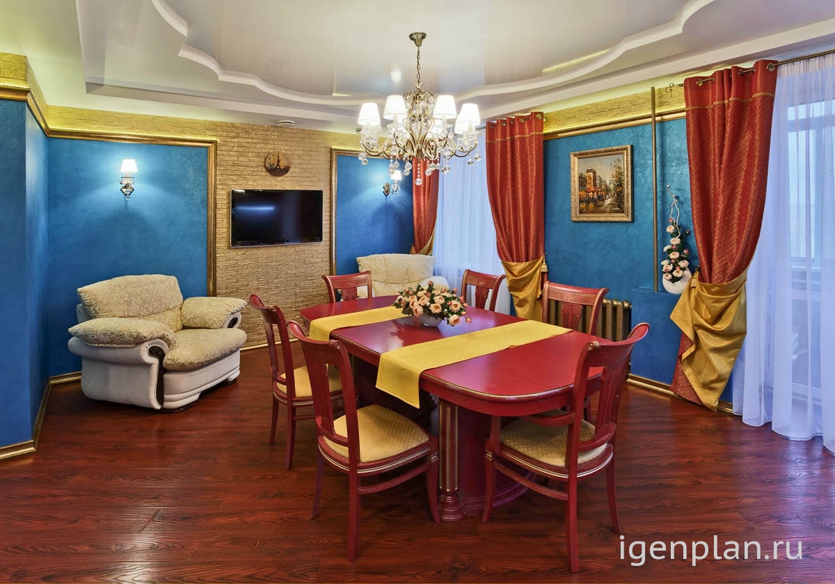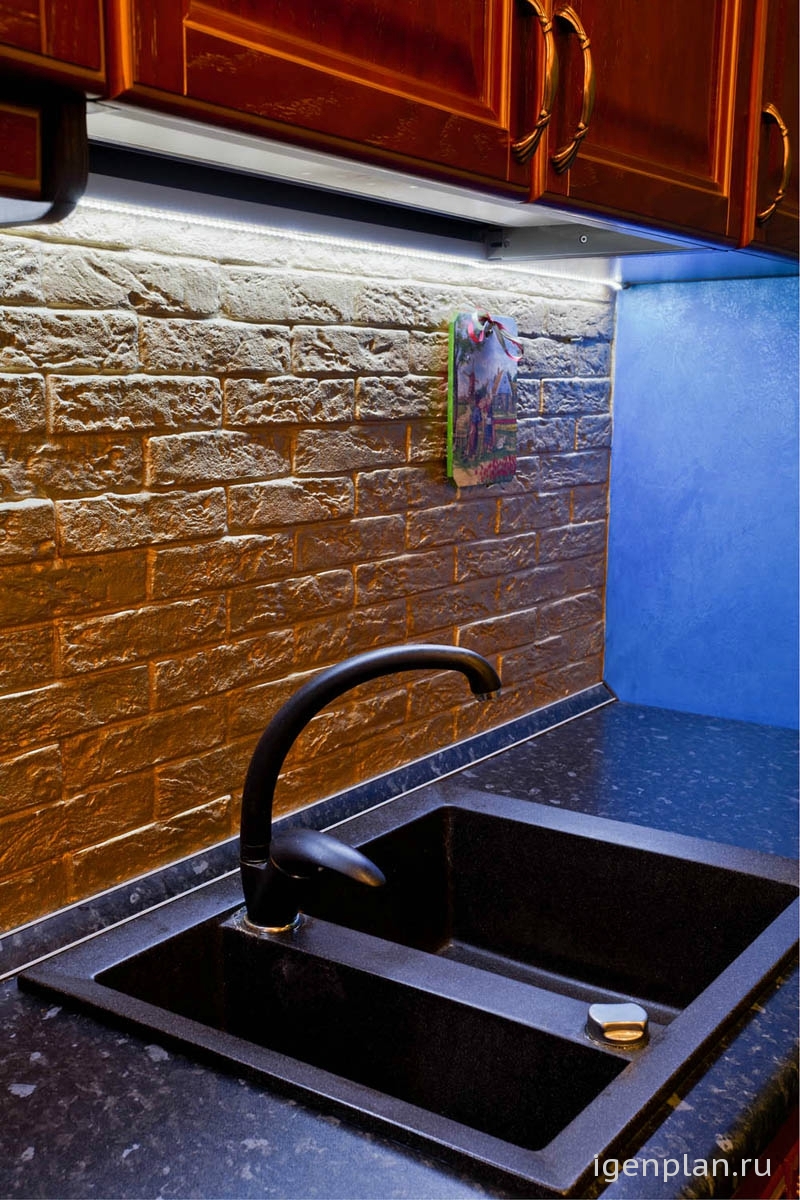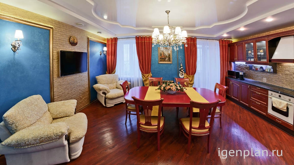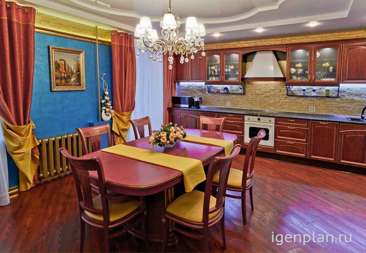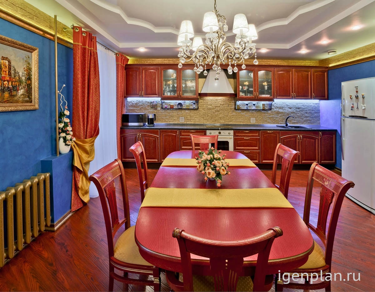 Дизайнеру удалось соединить водные акценты в виде панелей и роскошь капитанской кают-компании в одном проекте Мебель под старину, скругленные линии потолка из гипсокартона, сочетание красного и золотого в мебели с дубовым ламинатом полностью воссоздают картинки тех путешествий. Абсолютно уютная мебель в бежевых тонах словно приглашает капитана расслабиться после аперитива и покурить трубку А батареи, выкрашенные золотой краской – это просто последняя капля, после которой я сказала эта кухня – класс! Галина Николаевна |