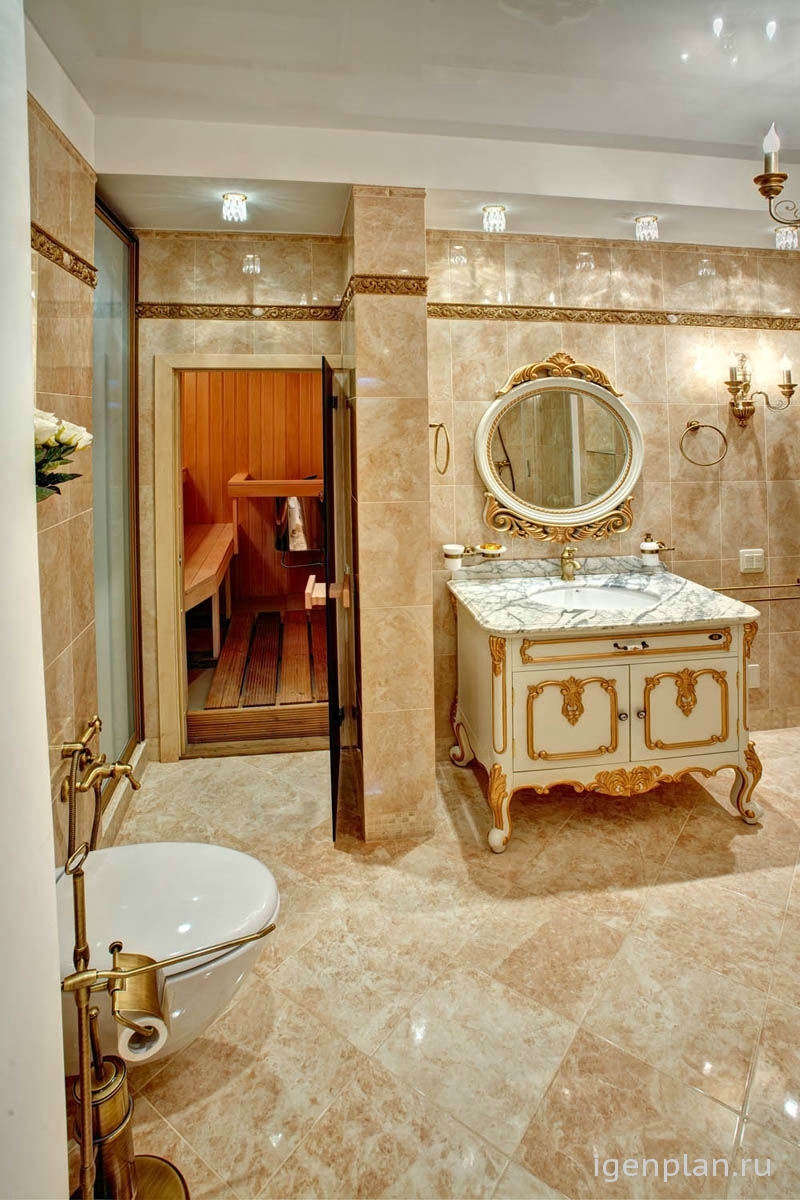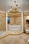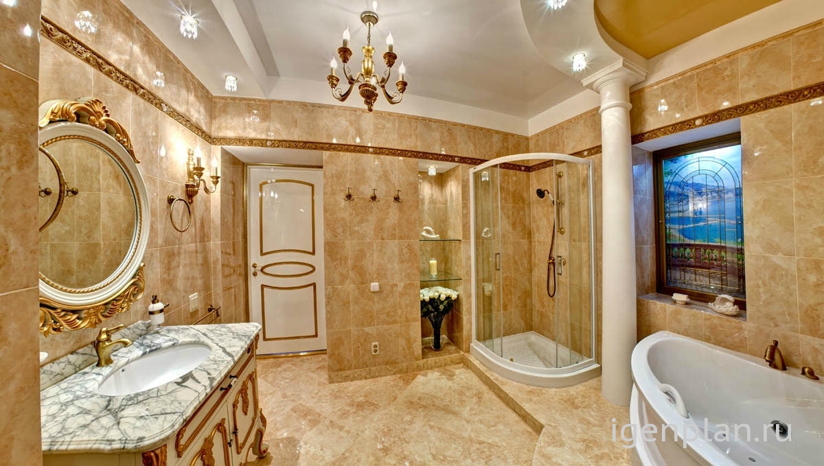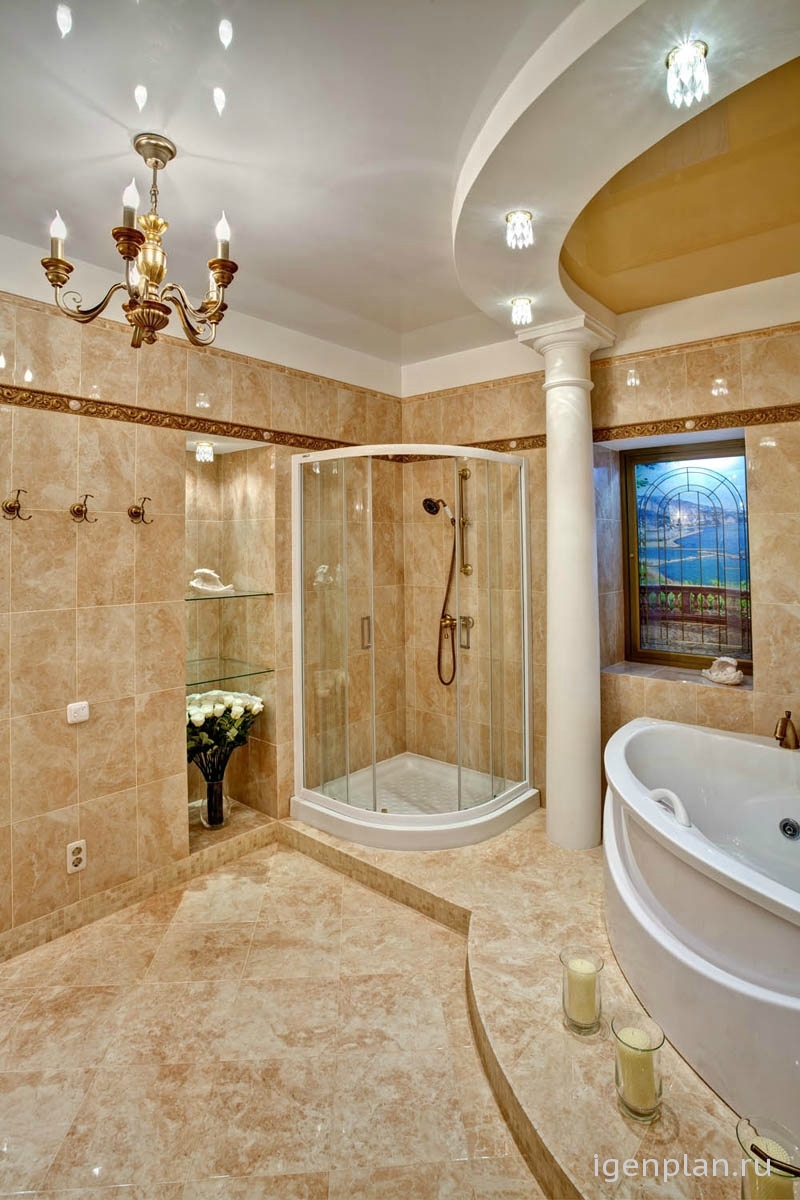 Мрамор, колонны, которые ничего не держат, а просто украшают, позолота Термы Агриппы вроде были для бедноты? А эта ванная комната явно для патрицианки российского образца Свечи и букеты цветов в нишах (даже над унитазом) – хозяйка любит себя и холенью-лелеянью своего тела уделяет и время и место И холодная баня (ванная) и горячая баня (сауна) и умеренно-теплый зал - все в соответствии с канонами римских терм. Наверное и минеральные ванны и ванны Клеопатры все здесь имеет место быть Возле чаши ванны окно или имитация окна? Витраж в тему! Натяжной потолок дублирует расположение основных зон и подчеркивает всё великолепие интерьера за счет дополнительных утопленных в потолочный молдинг точечных светильников |