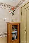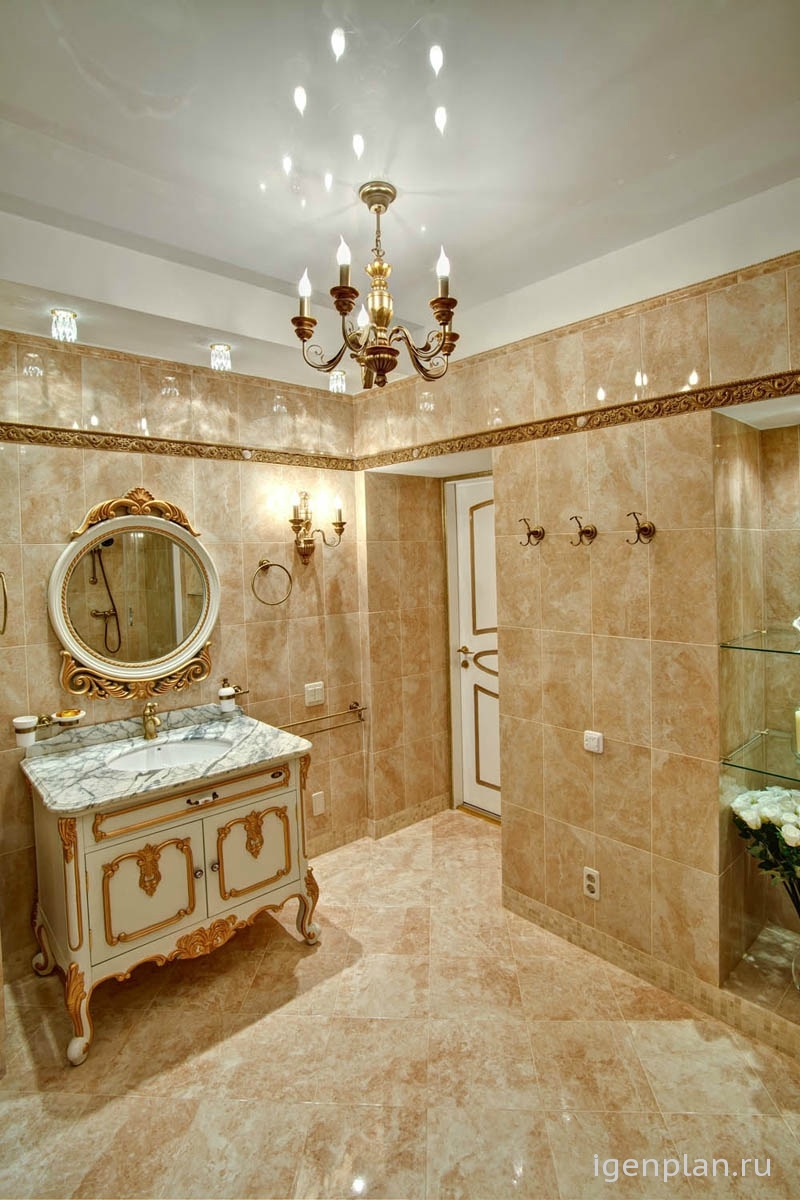 Терракотовая гамма плитки на полу и стенах, позолоченный бордюр по вверху стены, позолоченная фурнитура, люстра в виде шандалов со свечами …