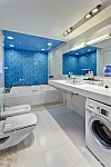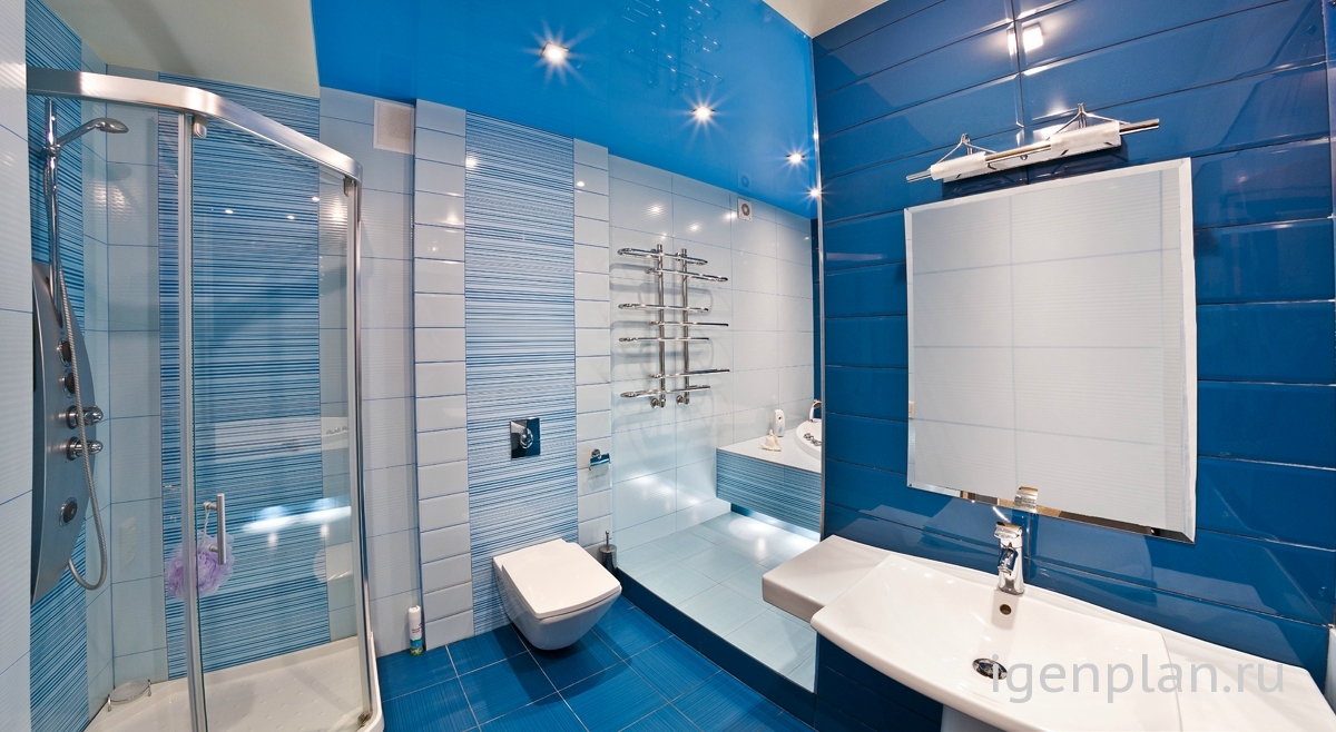 Интерьер полностью соответствует названию «Парусник» и всё вытекающее отсюда: море (то есть стены) синего синее, цвета насыщенной синьки (такой яростный тон не оставляет возможности для полета и даже вздохнуть сложно) и белые барашки, то есть сантехника, и солнечные блики, то есть утопленные светильники. А идея оформления ванной пошла от картинки, которая на стене возле умывальника ? |
